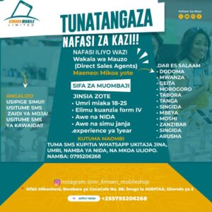 Kimaro Mobile Limited is seeking energetic and self-motivated individuals to join our team as Direct Sales Agents (Mawakala Mauzo). If you are passionate about sales, enjoy meeting new people, and want to advance your career in a fast-paced company, this is your opportunity.